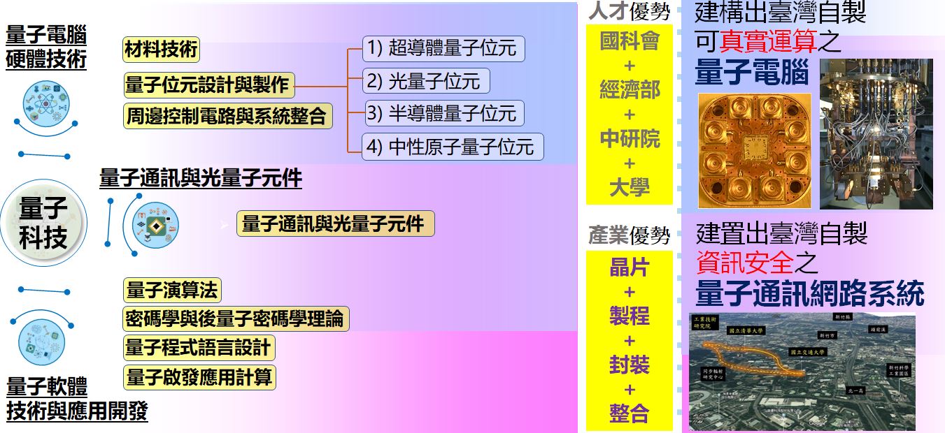量子系統推動小組召集人果尚志指出, AI結合量子科技是百年一遇的科技浪潮。政府將憑藉台灣強大的產業優勢與科研人才,打造台灣成為未來全球量子電腦之關鍵供應鏈,成為推動量子電腦小型化與商用化的關鍵力量。自2021年宣布啟動量子運算戰略以來,由國科會領軍,結合中研院、經濟部與大學端組成的跨部會量子國家隊,已在2022年至2026年期間加速台灣量子科技發展。透過整合IC設計、製程與封裝整合技術,台灣正建構出自主的量子通訊網路系統與可真實運算的量子電腦。