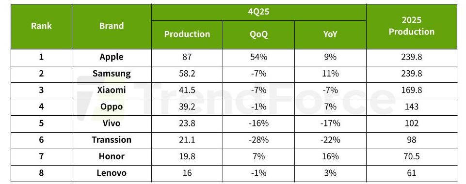 Apple:受惠於iPhone 17系列終端定價策略得宜,銷售告捷,帶動第四季產量季增逾50%,單季狂飆至約8,700萬支,創下歷史新高。TrendForce分析,若Apple在2026年能在終端定價上顯著讓利,將有助於在逆風中維繫生產與銷售表現。
