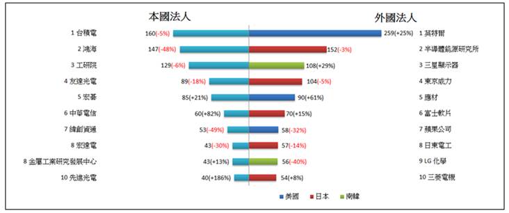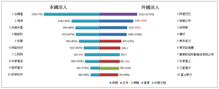 - 發明專利申請前五大,本國法人部分,分別為台積電(225件)、鴻海(114件)、友達光電(99件)、聯發科(97件)、宏碁(85件)。外國法人部分,分別為阿里巴巴(151件)、高通(135件)、英特爾(110件)、應材(108件)、東京威力(87件) (如圖1)。