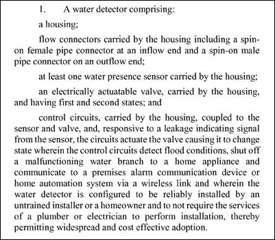 審查員對於美國專利號13/435,655的最終決定中以35 U.S.C. 112核駁了請求項1-20,原因是請求項1中的「configured to be reliably installed by an untrained installer or a homeowner and to not require the services of a plumber or electrician to perform installation, thereby permitting widespread and cost effective adoption」用語不明確,理由是請求項中並無提供任何可讓裝置或系統被配置至其所述功能的結構。