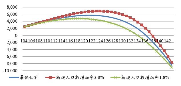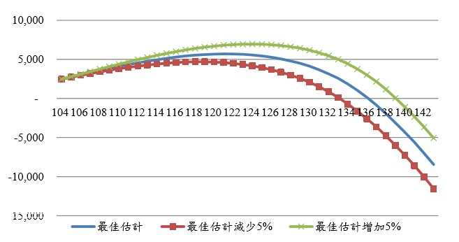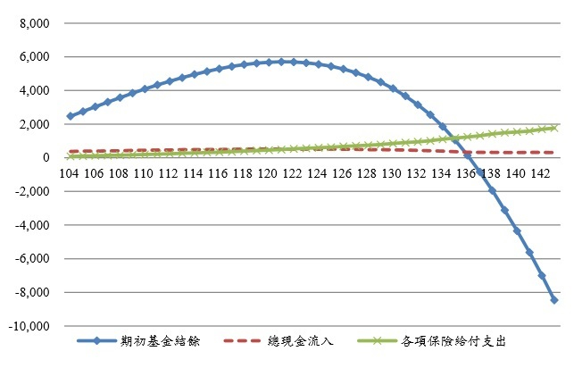 根據政府的委外估算,國民年金保險基金規模到2033年左右,會達到巔峰5706億元,之後開始逐年遞減,因為2033年起,總現金收入已經不足以支應保險給付,負的淨現金流造成基金餘額由累增轉為遞減。2050年以前,國民年金將會破產,除非提高保費和降低給付額,否則破產時間只會越來越近;就算基金的投資報酬率上升,幫助也相當有限。