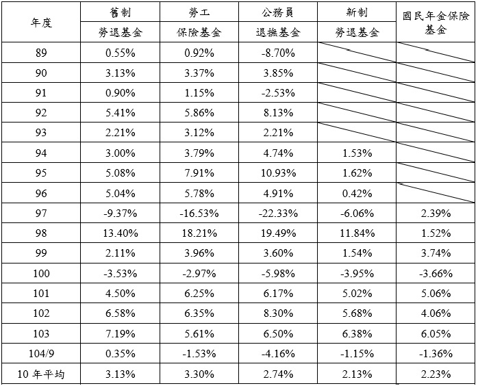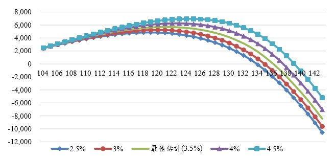 根據統計資料,在投資報酬率2.5%、3%、3.5%、4%、4.5%的情況下,分別在2045到2051年之間發生基金餘額不足以支付當年保險給付,也就是破產。從政府其他退休基金的歷年報酬率來看,平均超過4%的難度相當高,3%左右是發生機率較高的報酬率,但不管報酬率能否拉高到4%,基金破產之路都在前方,並不會消失。