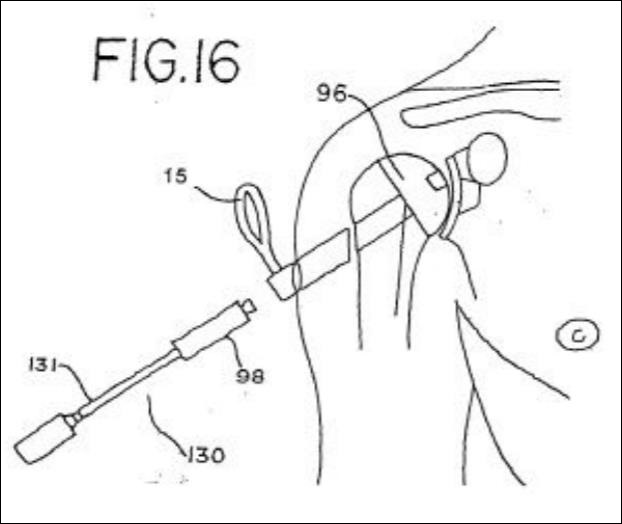 美國專利申請號13/068,309這件系爭專利是有關用於肩置換手術的肱骨植入物(humeral implant),如圖1(說明書的FIG.16)所示,肱骨植入物包括肱骨表面(humeral surface) 96,其被塑型以與肱骨頭(humeral head)相合,而柄(stem) 98則與遠離肩盂腔(glenoid cavity)的一側接合。