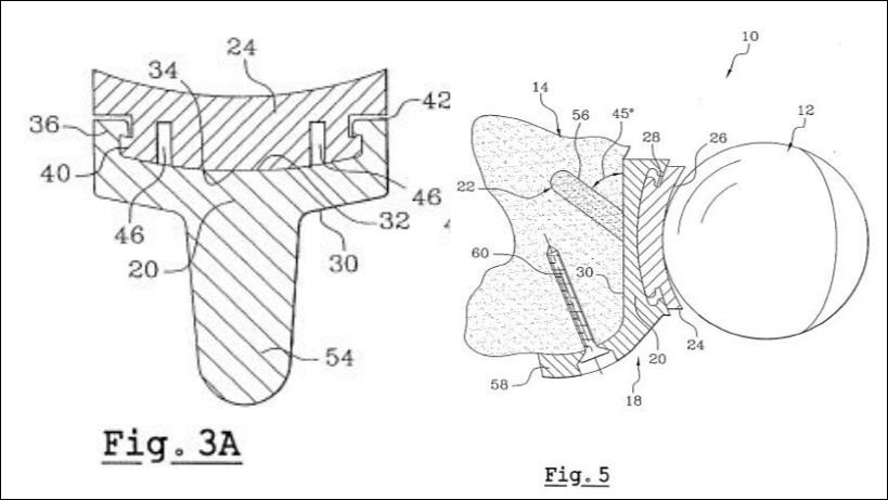 上訴方總共有三個爭辯理由,首先,Steven認為Leonard並未揭露請求項5的no stem之限制條件。Leonard揭示用於連接在肩盂腔的肱骨植入物,如圖2(FIG.3A與FIG.5)所示,該植入物包括壓板(platen)24,該壓板有一部分40置於基座20與肱骨頭12之間,而Steven認為該部分40是柄(stem),因為其從壓板的主體向外延伸。