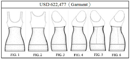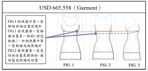 在D 622,377和D 666,384設計專利的說明書中清楚說明,圖式中以虛線或點線所描繪的人形,僅用於環境結構,並不構成所請求設計之一部分,不過,在6項專利所有圖式中,所請求的設計都顯現在衣服的外觀上,猶如穿著在身上一般。在專利請求項、設計說明或申請歷程檔案中,沒有任何跡象說明衣服內部是請求設計的一部分。