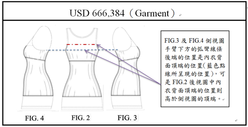 法院認為:D384專利的圖式也遭受到致命的不一致。FIG.2後視圖所揭露的衣服背面手臂下方主張設計的頂端部分(如圖5的FIG.2紅色點鏈線的位置)稍微高於其他圖式,而FIG.3和FIG.4所描繪內衣設計的背面頂部位置相當於服裝側面的頂部(如圖5中藍色點線的位置)。為了解決這種不一致,如果是支持後視圖所描繪的設計,而不是側面描述的設計,將會實質上改變D384專利權所涵蓋之設計標的。因此,D384專利權範圍是無法解決地模糊,因為不明確的而專利無效。