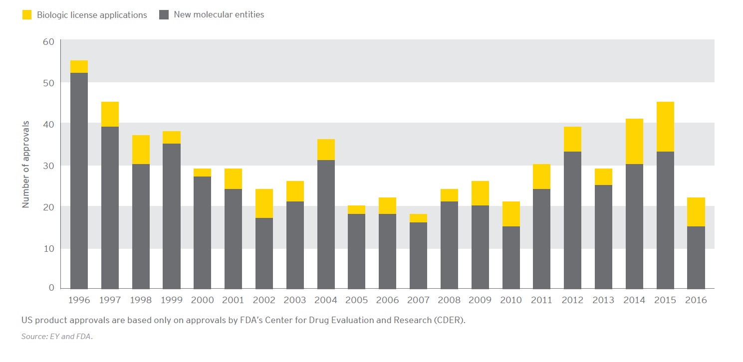 更大的問題發生在研發費用上。安永指出,FDA的查驗門檻越來越高:根據統計,2016年FDA核准通過的新藥申請只有22件,比起2015年的將近50件近乎腰斬,也終止了連續三年核准量正成長的趨勢(圖2)。影響所及,不但會拖慢了新藥上市的時間,也增加臨床試驗的失敗率,這些都會導致新藥研發的費用暴增。另一方面,在選擇研究題材時,幾乎所有藥廠都把資源投注在腫瘤和罕見疾病上。往好的方面來看,這代表癌症治療在未來可望有顯著的進步,但當資金群聚的效應愈發明顯時,這些投資能否創造相稱的回報,恐怕還在未定之天。