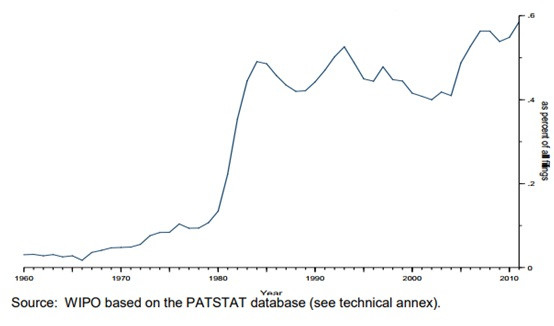 在智慧財產權對於人工智慧或機器人創新的保護,專利是創新保護最主要方式,由WIPO資料顯示,自1980年之後,機器人專利申請居高不下(圖1)。然而,WIPO報告指出有關機器人研究或產業相當平和,合作氣氛濃厚,專利似乎僅是用來協助特定發明人取得資金方式,而非阻止他人進入市場。