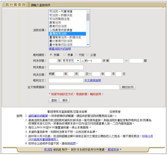 有使用過台灣司法院判決書查詢系統的民眾就知道,查詢系統主要是以「法院名稱」及「判決類別」來分類(如圖1所示),主要功能是讓使用者查詢特定案件的判決書,假設我今天要利用系統來查詢同類型或條件近似案件之所有判決書,那是不可能的任務。