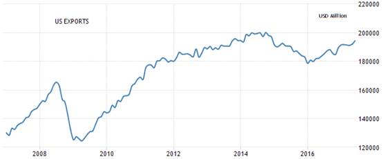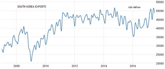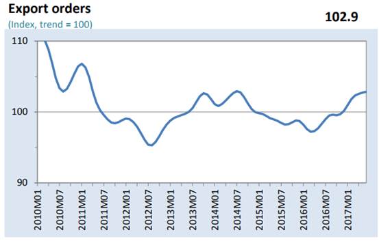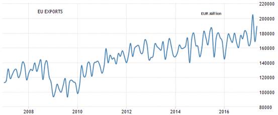 歐元區是全球另一個重要的消費市場,在多年的弱勢歐元環境下,歐元區的月出口額在2017年攀升到更高的水平,歐洲和美國的出口同步恢復成長動力。