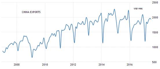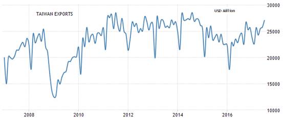 全球最大消費市場的美國,月出口額雖然還沒有回到2000億美元的高點,不過已經觸底反彈,重新回到上升趨勢;全球最重要的出口國中國月出口額雖然沒有重返歷史新高,但是2017年的情況有極高機率可以比2016年好轉。不過全球新興市場在製造出口的營運平均成本,已經逐漸被中國的營運成本上升所拋開,這對於中國出口產業來說,未來勢必會有更多競爭者,所以中國月出口額的年成長率,未來逐漸降溫,難以重返榮景是可預期的趨勢。