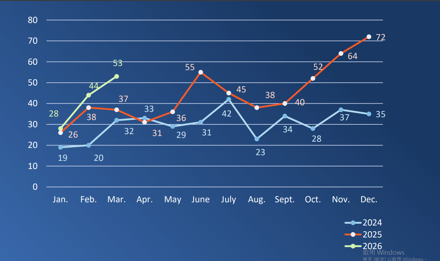 根據2024年至2026年的月度趨勢圖表,一審法院在2026年的開局表現強勁。1月收案量為28件,2月成長至44件,3月份更攀升至 53 件,呈現逐月增長的態勢 。這反映出專利權人對於新體系的信任度持續提升,且法律實務操作已趨於成熟。