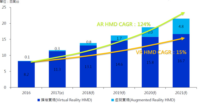 2016年擴增實境(AR)與虛擬實境(VR) 頭戴式顯示器(HMD)整體出貨量約為860萬台,其中VR HMD約820萬台、AR HMD約佔10萬台,整體硬體市場規格達17.89億美元。根據資策會產業情報研究所(MIC)推估,2021年AR/VR HMD整體硬體市場規模可達83.2億美元,出貨量上看3,100萬台。