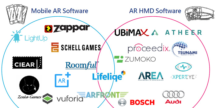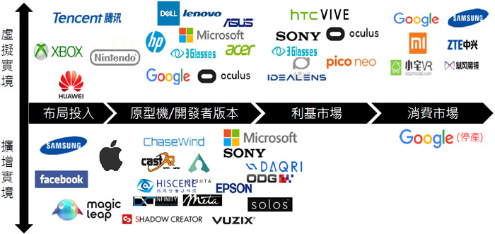 資策會產業情報研究所(MIC)產業分析師徐育群指出,無論是新創、大廠,或是關鍵業者,目前都在積極布局AR和VR HMD市場,AR生態系已初步成形,由關鍵與新創業者主導產業發展,Microsoft則扮演AR產業領頭羊,從應用、工具/平台、頭戴裝置三方面大量布局AR軟硬體產品。在新創業者方面,Magic Leap因掌握關鍵光場顯示技術受到市場關注,已獲得全球14億美元投資;以及設計工業界用穿戴式智慧頭盔的美國新創企業DAQRI,都以打造垂直應用解決方案為優先。