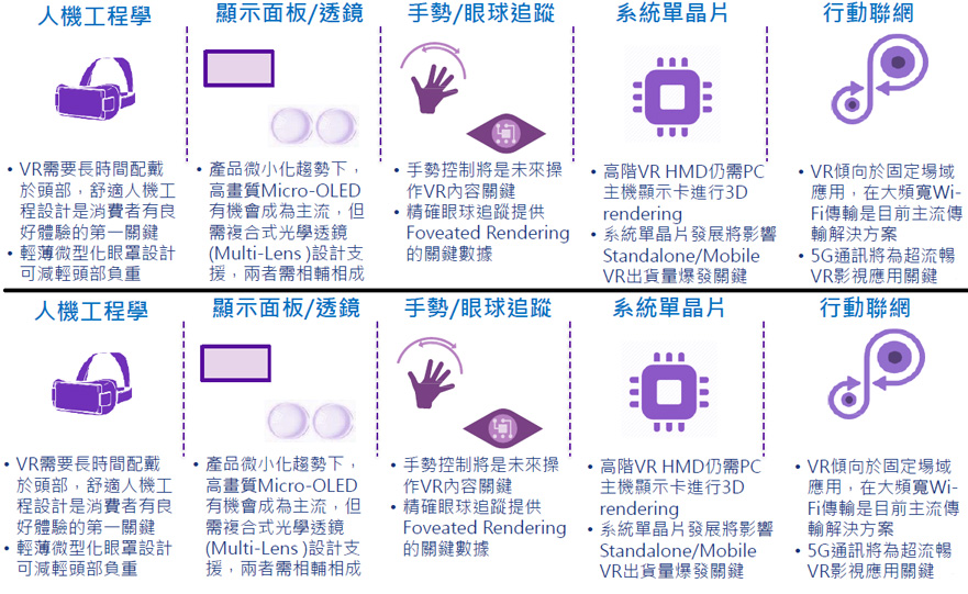 展望未來五年,AR/VR市場規模均呈現持續上升趨勢,而AR HMD的成長力道,將會大於VR HMD。徐育群分析,由於AR HMD硬體設計難度高,像是光學透鏡、微型顯示裝置(光機整合)、電池續航力等,目前大部分產品定位仍處於原型機,商品化程度低;VR HMD方面,關鍵零組件與硬體組裝相對成熟,商品化程度也比較高,隨著未來產品設計走向微小化,高畫質Micro-OLED與複合式透鏡成為關鍵。