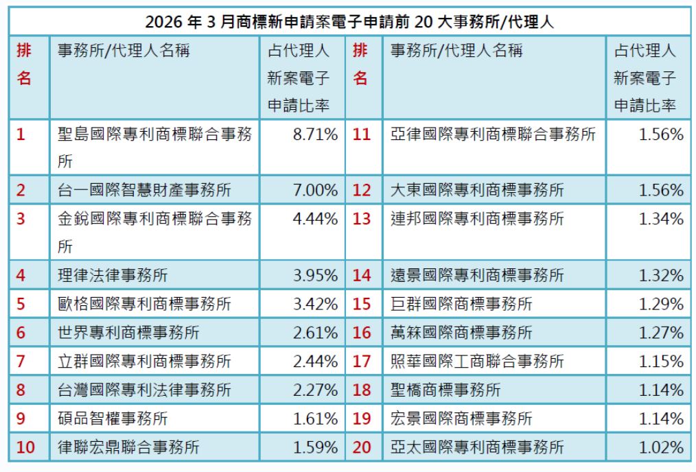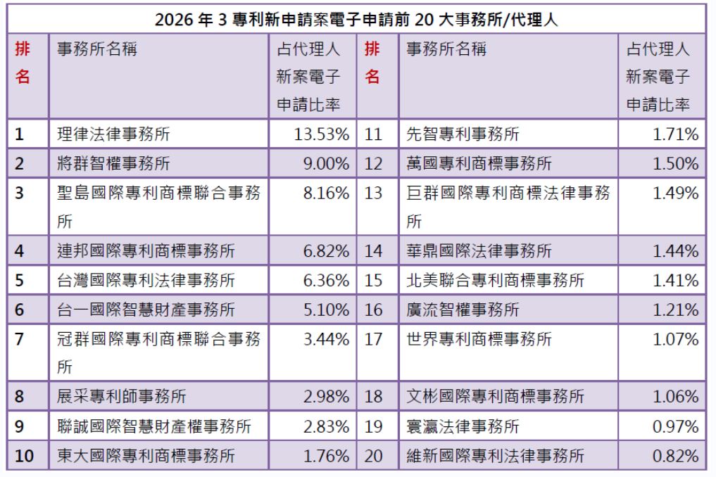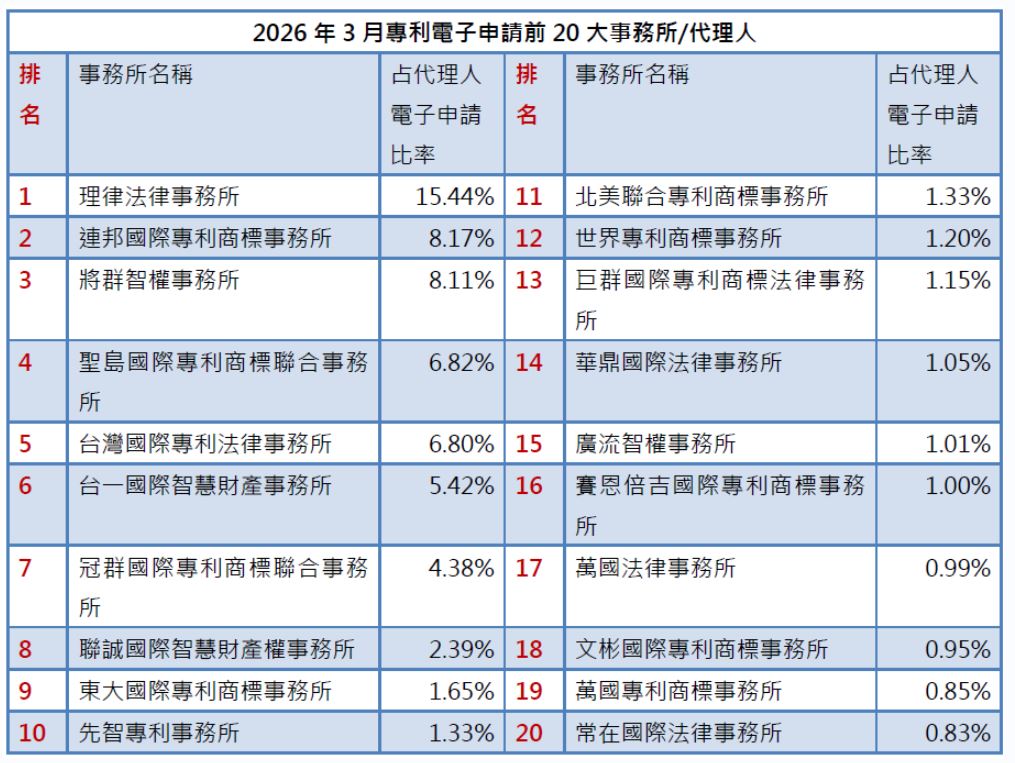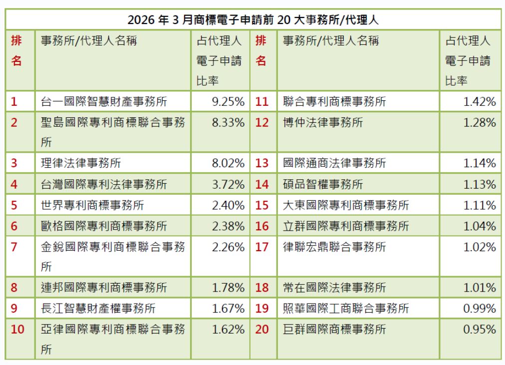 若單純聚焦於「新申請案」的電子送件動能,3月專利新案前二十大事務所依序為理律、將群、聖島、連邦、台灣國際、台一、冠群、展采、聯誠、東大、先智、萬國、巨群、華鼎、北美、廣流、世界、文彬、寰瀛及維新。商標新案前二十大則為聖島、台一、金銳、理律、歐格、世界、立群、台灣國際、碩品、律聯、亞律、大東、連邦、遠景、巨群、萬箖、照華、聖橋、宏景與亞太。這些指標性事務所的高送件量,直接推升了台灣智財行政效率的整體指標。