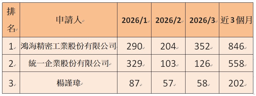 除了高度仰賴外部代理人,國內指標性企業在自主送件的表現上亦相當亮眼。統計2026年第一季自行申請的電子送件總量,鴻海以累計846件的壓倒性數量穩居冠軍,單在3月份就送出了352件,顯示其在全球供應鏈重組下仍持續擴大技術護城河。傳產與食品龍頭統一企業則以累計558件名列第二,3月份單月送件達126件,反映出品牌商標與包裝專利的密集佈局。第三名則為自然人楊謹瑋,第一季累計送件達202件。