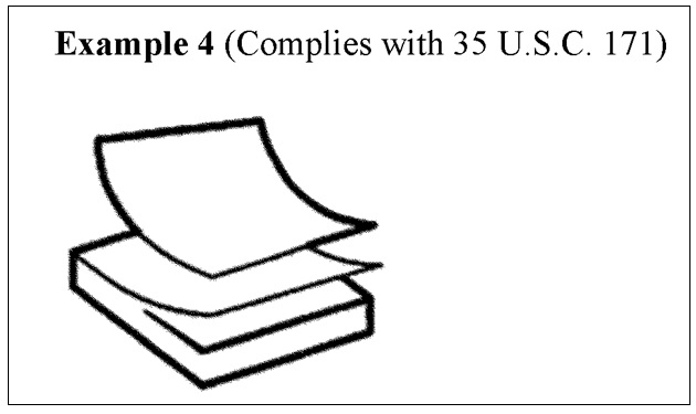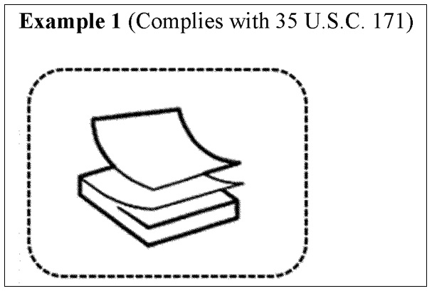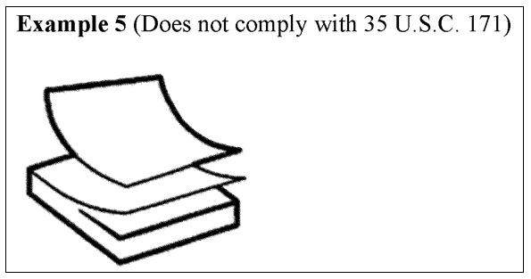 如前所述,範例5所要求保護的設計不符合35 U.S.C. 171規定,原因為(1)標題、權利要求和說明書均未提及任何製成品;且(2)附圖也未描繪任何製成品。這顯示在新規定下,標題的法律效力被大幅強化。標題不再只是行政標籤,而是決定專利適格性的實質要件。