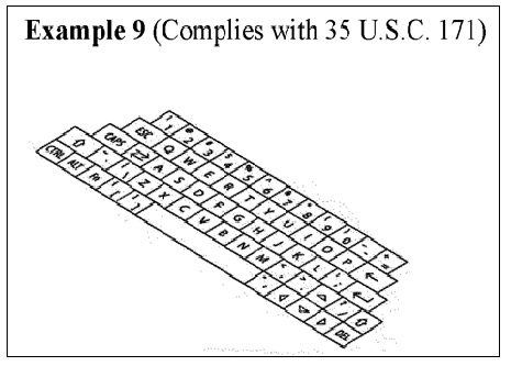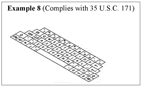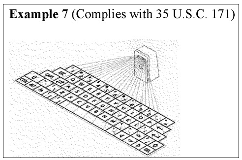 - 範例 8 (投影模式):標題為「用於電腦之投影鍵盤界面」(Projected interface for a computer system),即使圖式僅顯示鍵盤排列,由於標題指向「電腦」,因此符合35 U.S.C. 171。