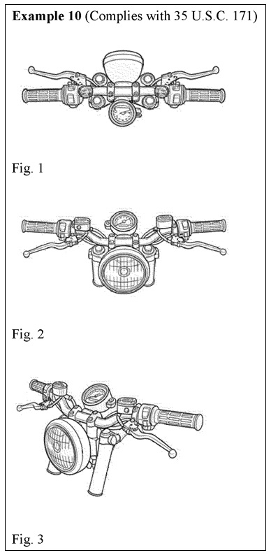 - 範例 10 (VR模式):標題為「適用於電腦的虛擬實境摩托車介面」(Virtual Virtual reality motorcycle interface for a computer)。此範例假設圖1-3提供了足夠的視圖,足以構成 37 CFR 1.152 所要求的對設計外觀的完整公開。但是,申請人仍必須確保在提交的申請中對設計進行充分的公開。