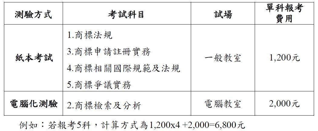 表1. 商標專業能力認證考試科目及費用;資料來源:TIPO