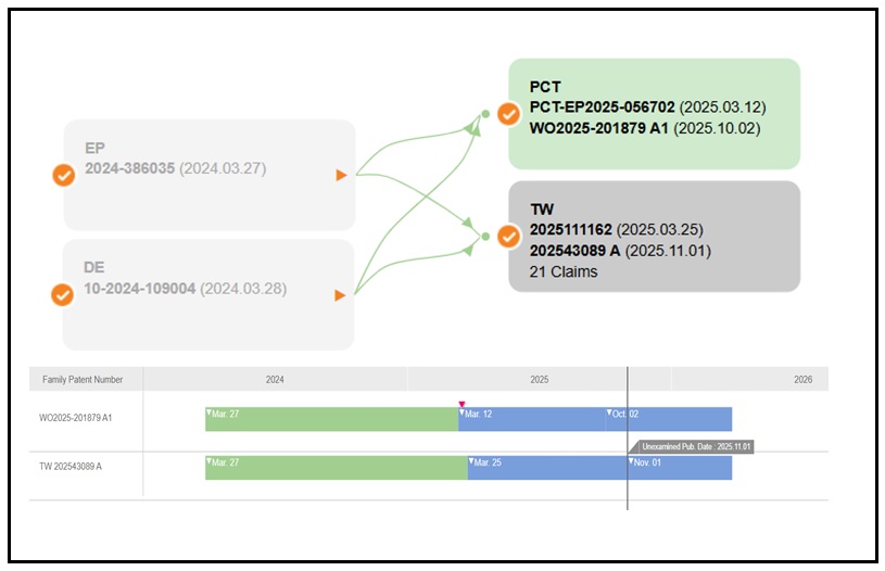 观察该专利家族的申请轨迹(图1),可以发现科林堤斯在微通道液冷领域的严密布局。该家族最早于2024年3月27日向欧洲专利局(EPO)提交申请(EP-Priority 24386035.0),随即在隔日于德国(DE)提出申请(DE-10 2024 109 004.9)。这种连续的优先权主张,显示了该技术在欧洲工业体系中的战略地位。随后,该公司透过 PCT 国际申请路径(WO 2025/201879 A1)向全球延伸,并同步在台湾布局TW 202543089 A,其PCT国际专利申请案和台湾专利申请案之优先权日、申请日与专利公开日请参见图1。这种「一案多投」且迅速推进的策略,反映出该公司深知在 AI 服务器供应链中,台湾作为全球先进封装与代工重镇的地位。透过该专利家族,科林堤斯建立跨区域的专利布局,确保其「非均匀流道优化技术」在下一代异质整合芯片冷却市场中建立先行者优势。